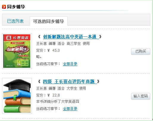 1)选择图书。点击“可选的同步辅导”,选择自己想要学习的图书,点击“输入密码”按钮,输入密码即可选中。